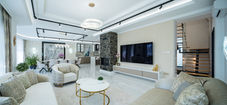 A részletekben visszaköszönő szálcsiszolt bronz és arany kiegészítők, valamint a hangsúlyos fekete márvány elemek tovább fokozzák a luxusérzetet. Az álmennyezeti kialakítás dinamikus vonalvezetése, valamint a modern sínrendszeres és design világítások kortárs, elegáns atmoszférát teremtenek, amely méltó módon emeli ki a villa egyedi karakterét.